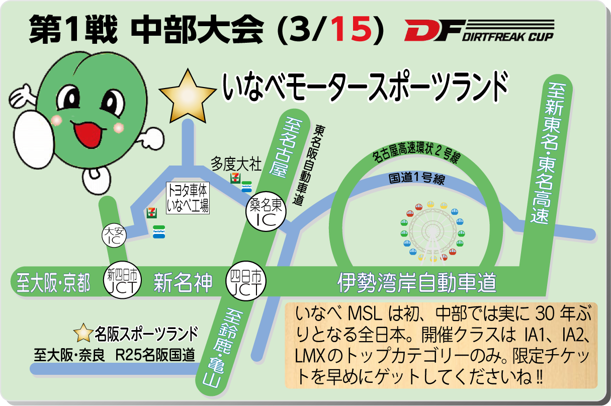 開幕戦中部大会はなんと30年ぶりの復活開催。会場のいなべモータースポーツランドは全日本初開催、しかも主催は全日本チャンピオン&プレーイングマネージャーの小島庸平君。愛知に本社を構えるダートフリークが大会をバックアップします。駐車場スペースの関係で限定発売が事前告知された観戦チケットは、1月17日に先行販売が開始されるとのこと。