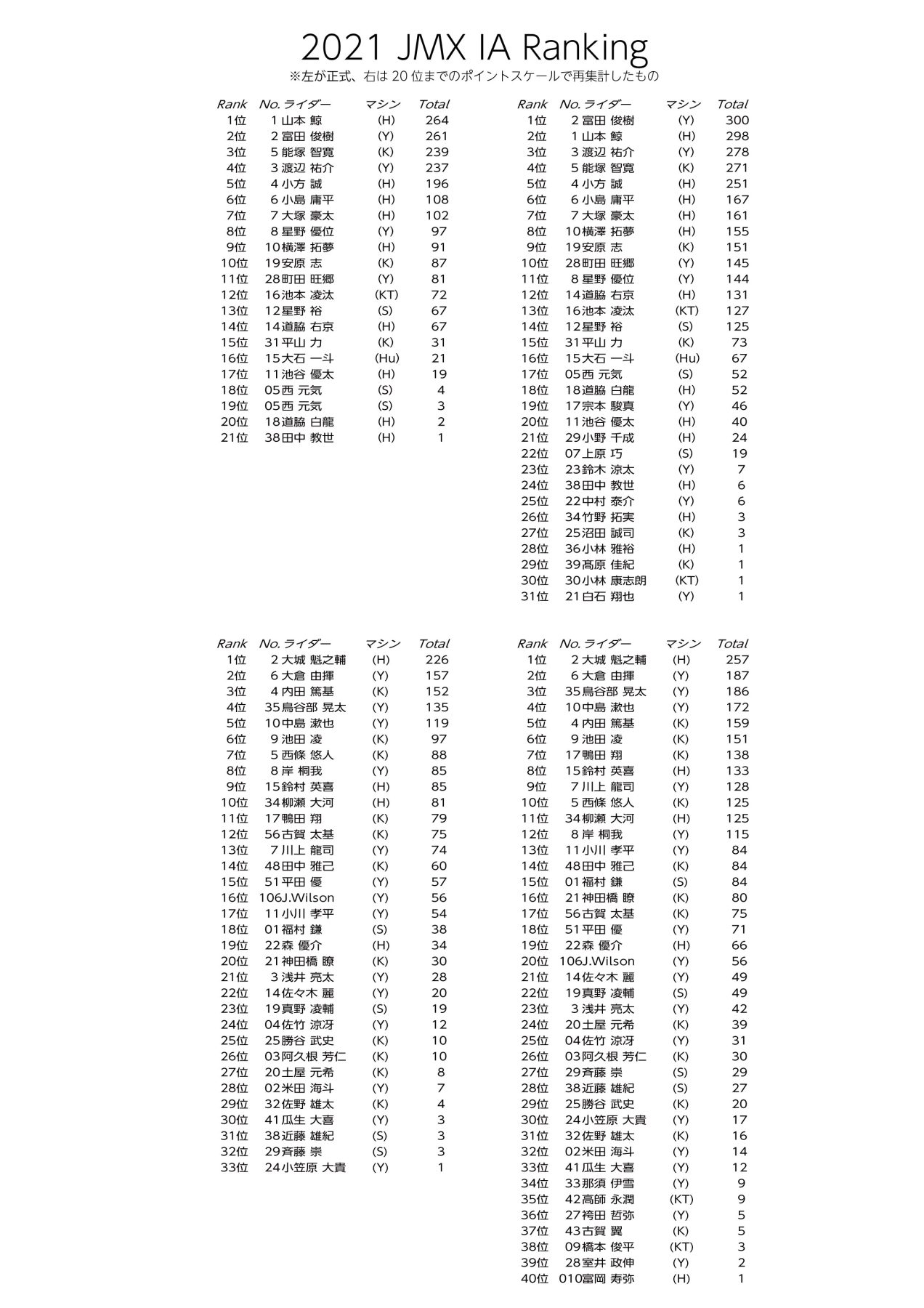 今更説明の必要もないと思うが、モトクロスはスタートの良し悪しが結果を大きく左右する。ギリギリ予選通過を果たしたライダーがホールショットから逃げきって勝つことはまずあり得ないが、過去のレースを振り返って見ても、20位以内に踏みとどまることは十分あり得るように思う。逆に考えれば、20位1ポイントのスケールだと、決勝に駒を進めた全ライダーに1ポイントのチャンスが与えられる。しかし15位1ポイントだとそのチャンスは大きく遠ざかる。画像のランキング比較からそれを感じ取ることはできないだろうか。